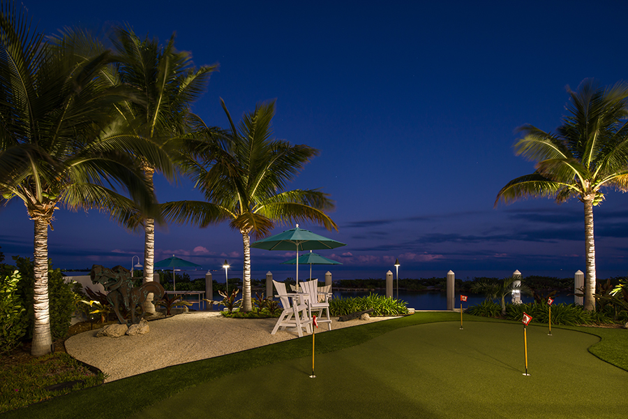 With 230 Coastal Source light fixtures installed throughout the property, the lighting approach at Jasmine House prioritizes subtlety and even distribution. “Smaller wattage fixtures ensure a soft glow without creating unwanted hotspots, which was a preference of the homeowners,” said D’Asign Source’s Nick D’Ascanio. Unlike traditional landscape designs with designated path lights, Jasmine House features hardscape pathways integrated into artificial grass, necessitating a unique lighting strategy. To accommodate this, niche markers and conduits were used to minimize disruptions to the artificial turf while ensuring ease of serviceability.